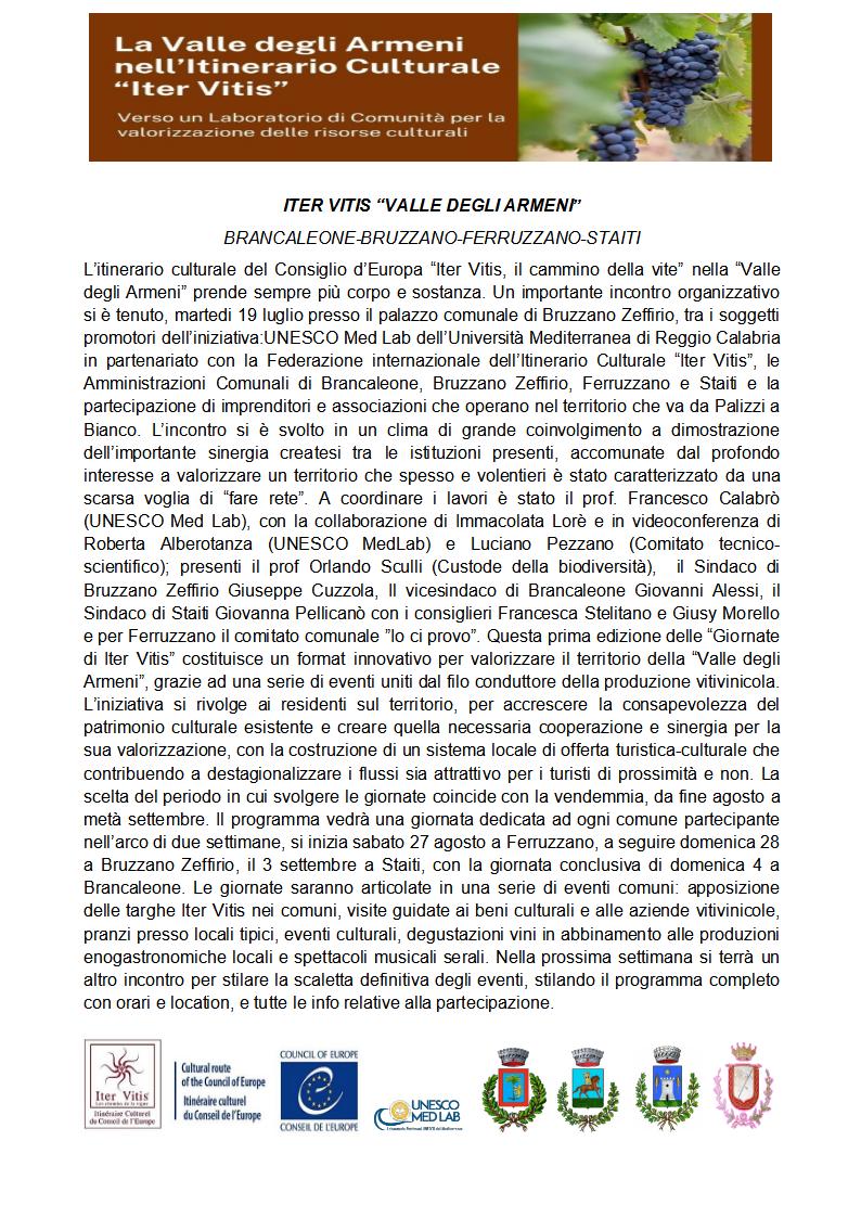 L’itinerario culturale del Consiglio d’Europa “Iter Vitis, il cammino della vite” nella “Valle degli Armeni” prende sempre più corpo e sostanza.